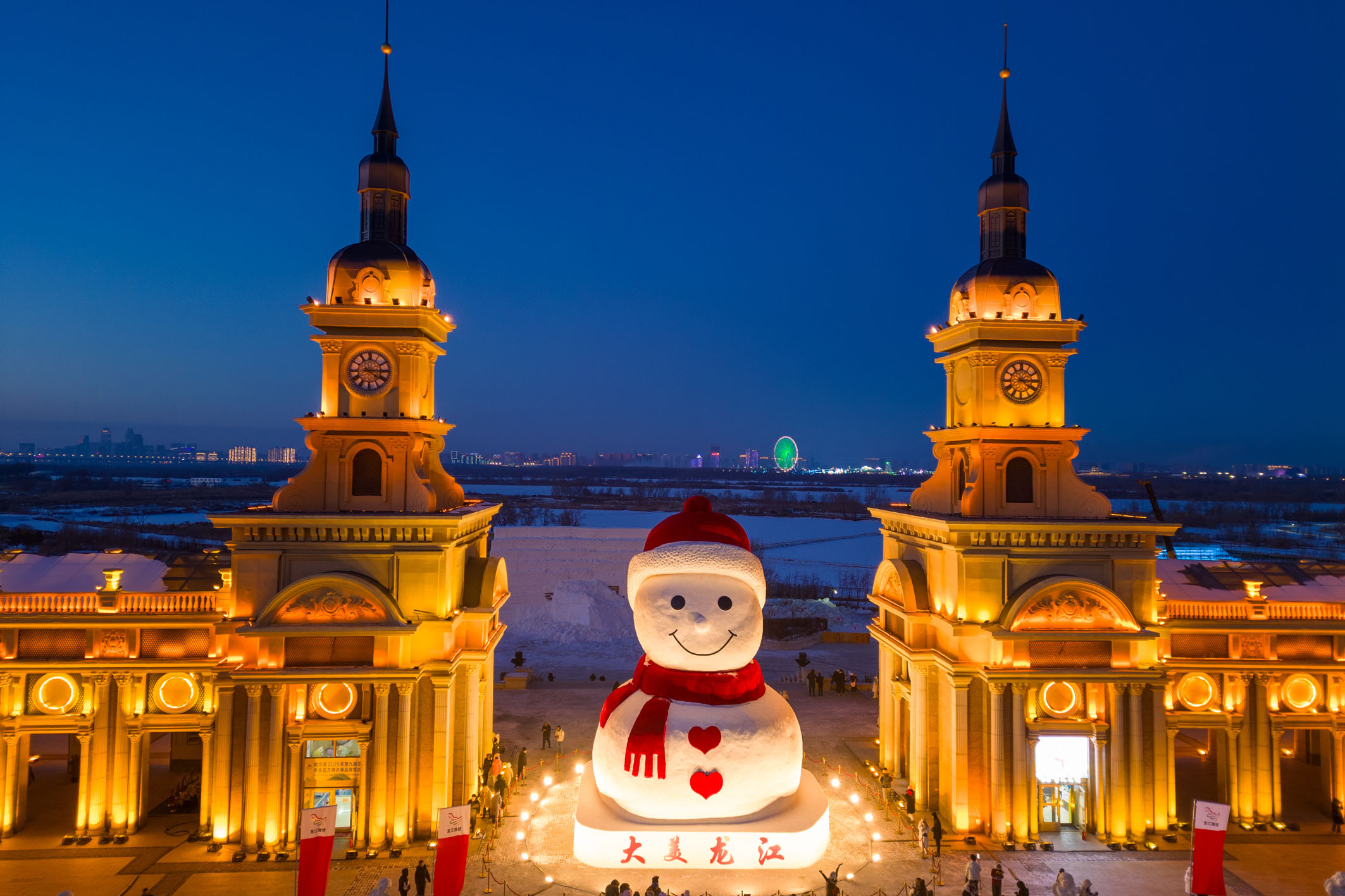 12月17日,游客和市民在哈尔滨松花江畔的大雪人前游览(无人机照片)。当日,哈尔滨“网红”大雪人“回归”松花江畔。