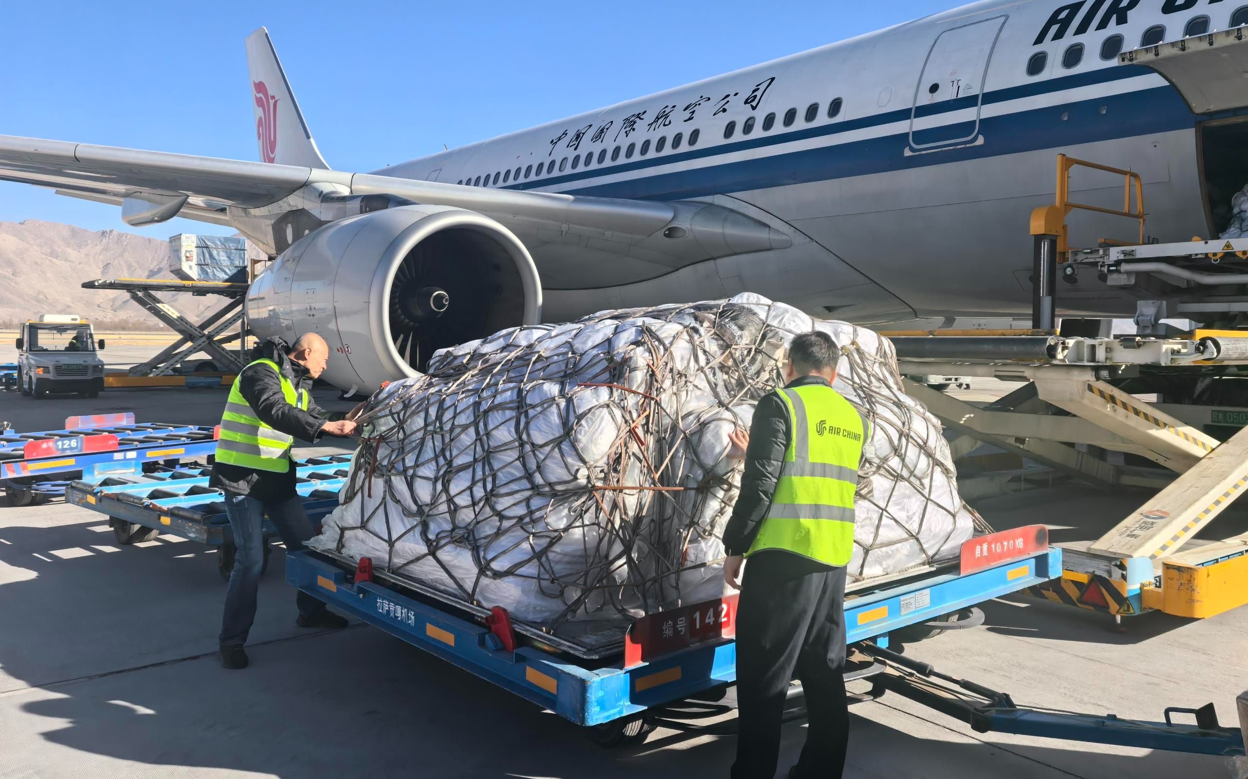 国航CA4401航班运送救援物资抵达西藏拉萨。国航供图