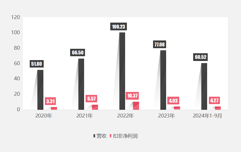 近年来,川发龙蟒业绩保持着大幅增长态势,但2023年出现了较大转折。年报数据显示,2020年至2023年,川发龙蟒营业收入分别为51.80亿元、66.50亿元、100.23亿元、77.08亿元,其中2023年同比下滑23.10%;扣非净利润依次为3.31亿元、6.57亿元、10.37亿元、4.03亿元,其中2023年同比下滑61.13%。不过,川发龙蟒去年业绩有所回升,2024年1至9月,公司实现营业收入60.52亿元,同比增长11.06%;实现扣非净利润4.27亿元,同比增长42.32%。
