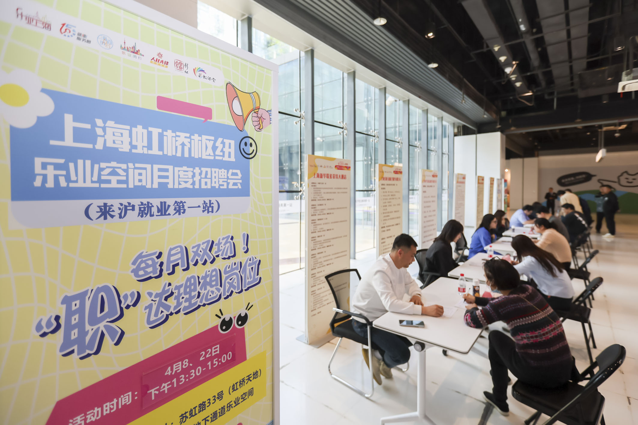 这是4月8日拍摄的上海虹桥枢纽乐业空间月度招聘会现场。当日,上海虹桥枢纽乐业空间举行4月首场招聘会。该平台为求职者提供“一站式”就业服务,自运营以来,累计完成求职登记200余人次,接听就业咨询电话600余通,举办就业指导服务活动17场,服务群众超3000人次。