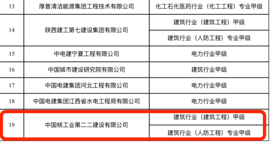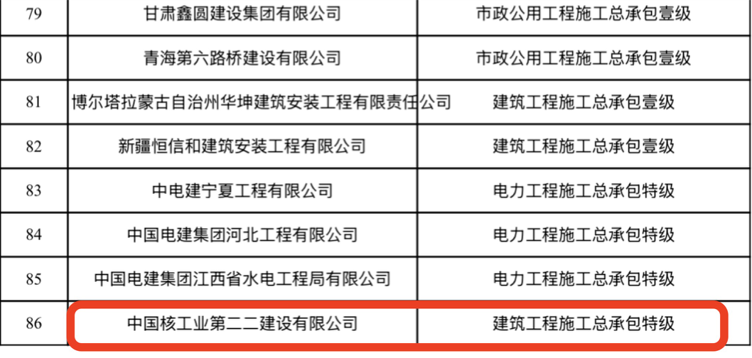 记者注意到,住建部于2024年5月发布了《关于核准2024年度第五批建设工程企业资质名单的公告》,其中,中核二二取得建筑工程施工总承包特级资质及其相应工程设计建筑行业(建筑工程)甲级、工程设计建筑行业(人防工程)专业甲级资质。