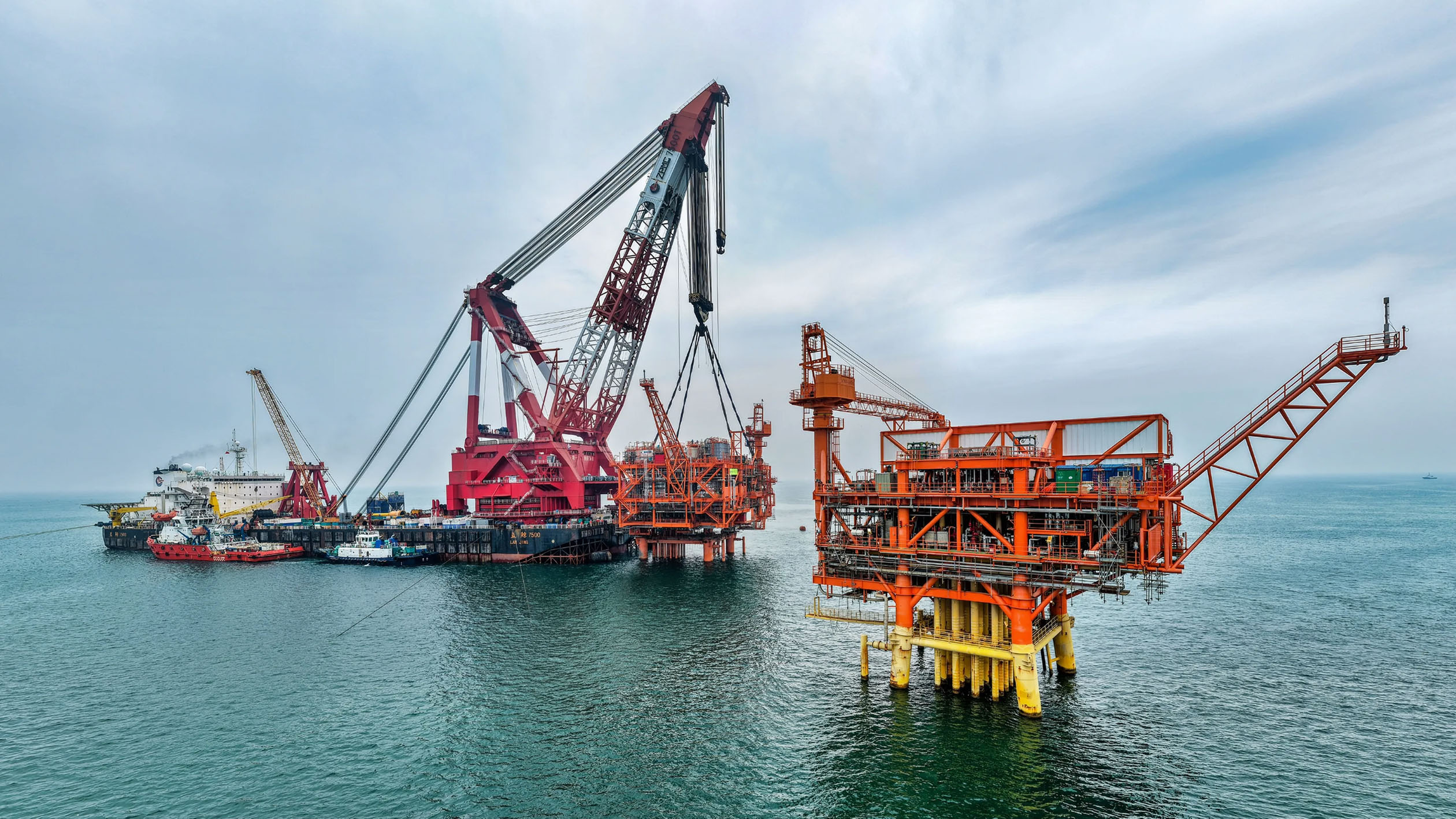 9月8日,垦利6-1油田10-1北区块Ⅱ期开发项目油气平台在渤海海域完成海上安装(无人机照片)。垦利6-1油田位于渤海南部海域,石油探明地质储量超1亿吨,是我国在渤海莱北低凸起浅层勘探领域发现的首个亿吨级岩性大型油田。