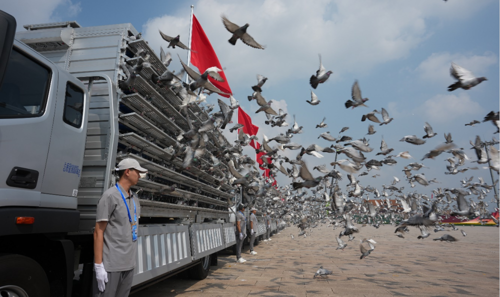 10月1日,北京天安门广场庄严的升国旗仪式后,数万羽和平鸽振翅高飞,将全国人民对和平与繁荣的祝愿洒满天际。北汽福田第十五次担任重要场合运输鸽子的任务。