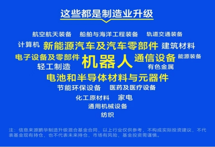 鹏华制造升级混合投资策略为制造升级主题,涵盖以高端化和智能化推动的高端装备制造业、以高新技术引领具有高技术附加值、代表新经济发展趋势的制造业领域和以技术提升和优化调整为目标的传统制造业。