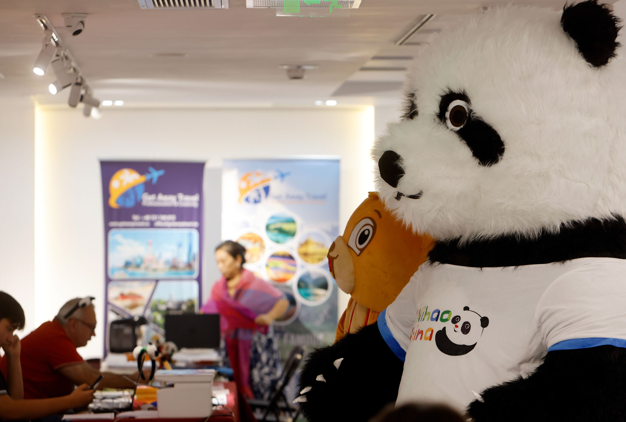 2025中国旅游展近日在罗马尼亚首都布加勒斯特开幕,中罗两国文化、旅游、教育等领域百余名代表出席开幕式。图为2025中国旅游展上的吉祥物。
