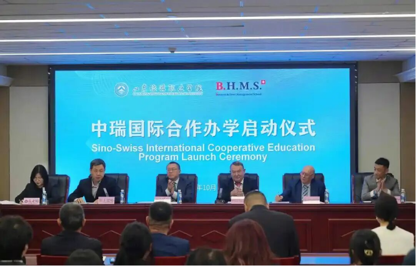 10月15日上午,山东旅游职业学院中瑞国际合作办学启动仪式暨中瑞(瑞中)美食艺术示范教学实践基地揭牌仪式顺利举办。学院党委书记闫向军,党委委员、副院长王建峰,瑞士Benedict 教育集团总裁 Heinrich Konrad Meister、瑞士工商酒店管理学院(BHMS)院长 Anthony Joseph Erb 及教师代表出席仪式。