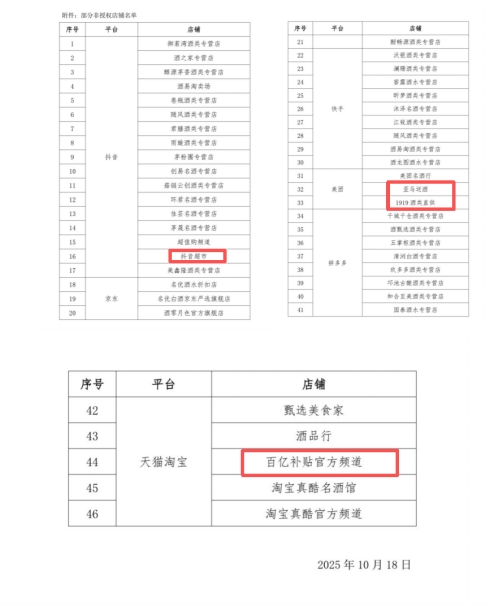 值得注意的是,五粮液还首次公开了46家“非授权店铺名单”,各大电商的第三方店铺均有上榜,此外还点名了多家电商的官方店铺或官方频道,包括抖音超市、美团名酒行、1919酒类直供、歪马送酒、天猫淘宝的百亿补贴官方频道等。