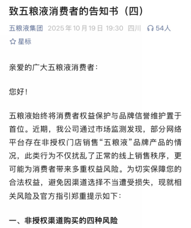 10月19日晚间,五粮液(000858.SZ)官方微信发布《致五粮液消费者的告知书(四)》。五粮液称,近期,该公司通过市场监测发现,部分网络平台存在非授权门店销售“五粮液”品牌产品的情况。