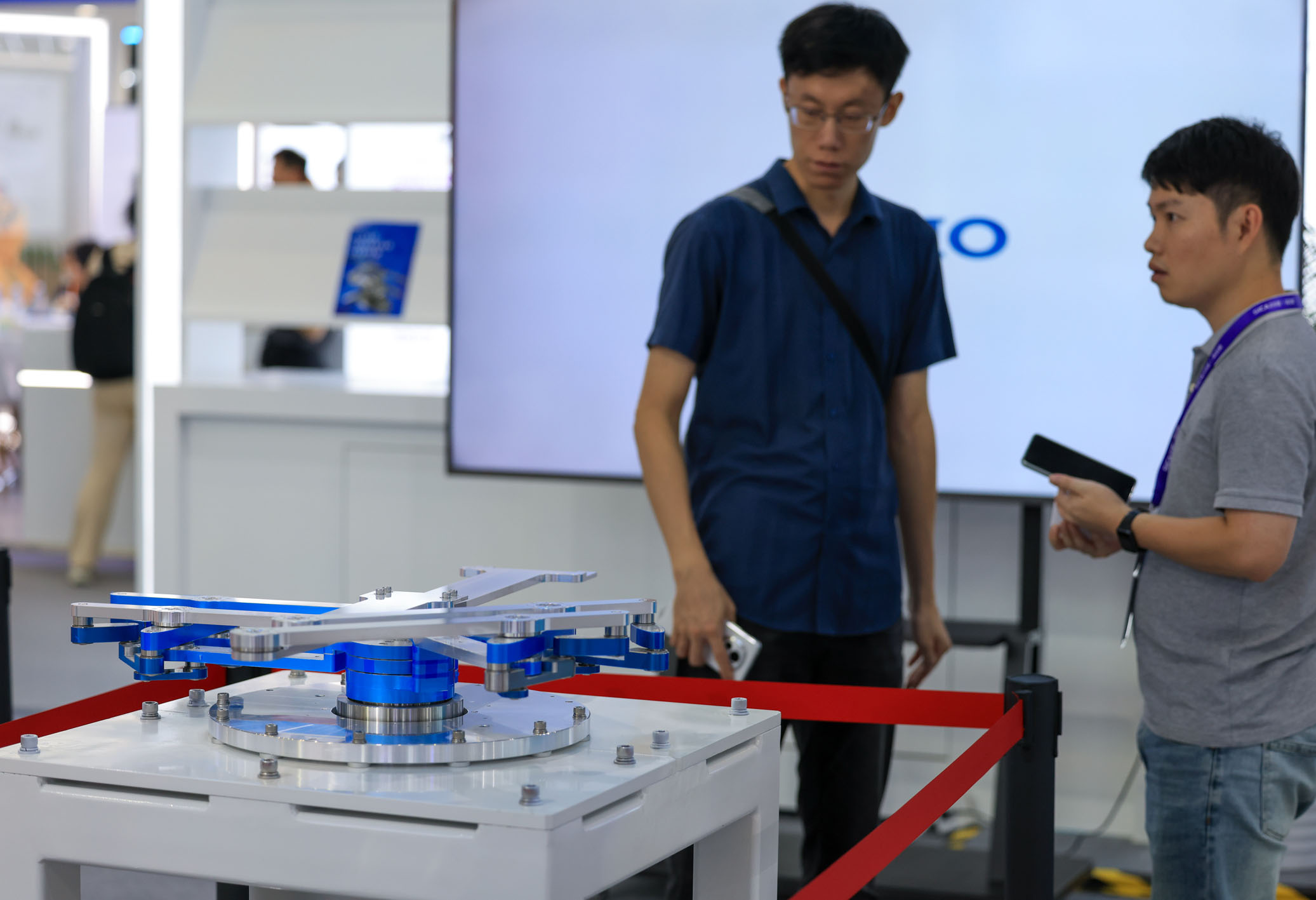 在2025湾区半导体产业生态博览会(湾芯展)上,参观者了解一台晶圆搬运机器人。新华社记者 毛思倩 摄