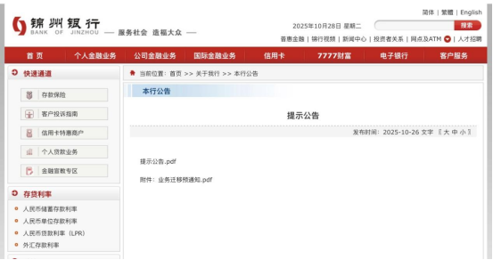 根据锦州银行官网10月26日发布的“提示公告”,双方已签署《收购承接协议》,确保锦州银行依法开展的商业银行业务及资产负债由工商银行受让。锦州银行存款人的合法权益将不受影响,工商银行将依据相关法律法规和监管规定,继续为客户提供商业银行服务。在转让准备期间,锦州银行客户可继续通过其线上、线下渠道办理业务。