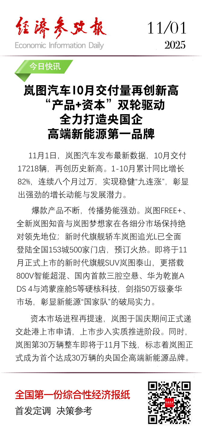 资本市场进程再提速,岚图于国庆期间正式递交赴港上市申请,上市步入实质推进阶段。同时,岚图第30万辆整车即将于11月下线,标志着岚图正式成为首个达成30万辆的央国企高端新能源品牌。(刘璐璐)