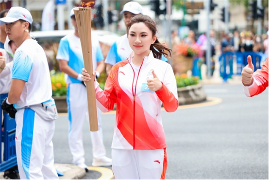 在澳门站,作为大湾区民营企业代表,立白科技集团副总裁陈丹娜手持火炬稳步跑过传递路段。