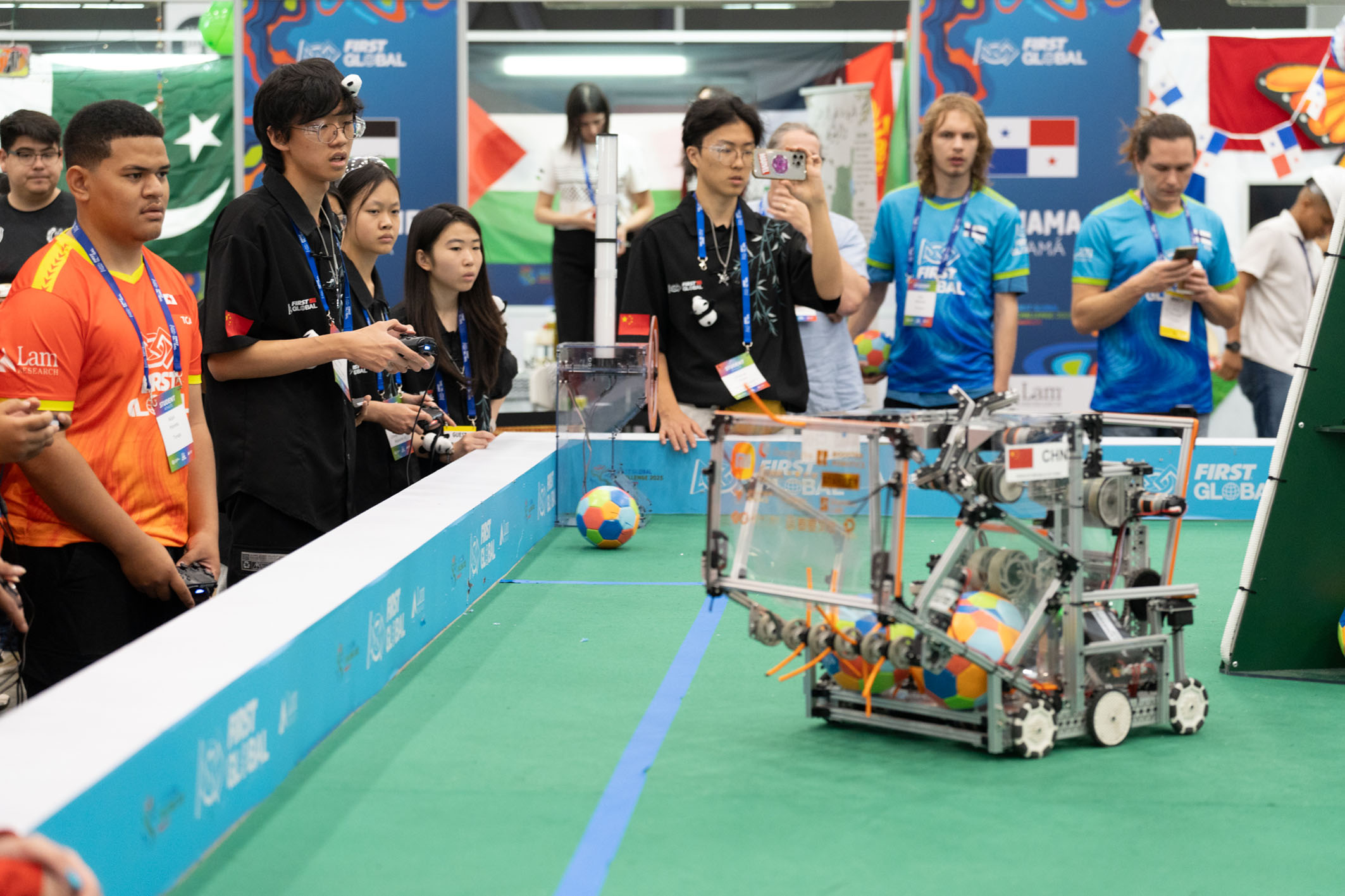 2025年FIRST全球机器人挑战赛近日在巴拿马首都巴拿马城举行。中国队在本届赛事中获得了FIRST全球排位赛第三名、FIRST技能挑战赛第三名以及乌斯塔德·艾哈迈德·拉霍里工程创新奖银牌。图为中国队队员在参加练习赛。