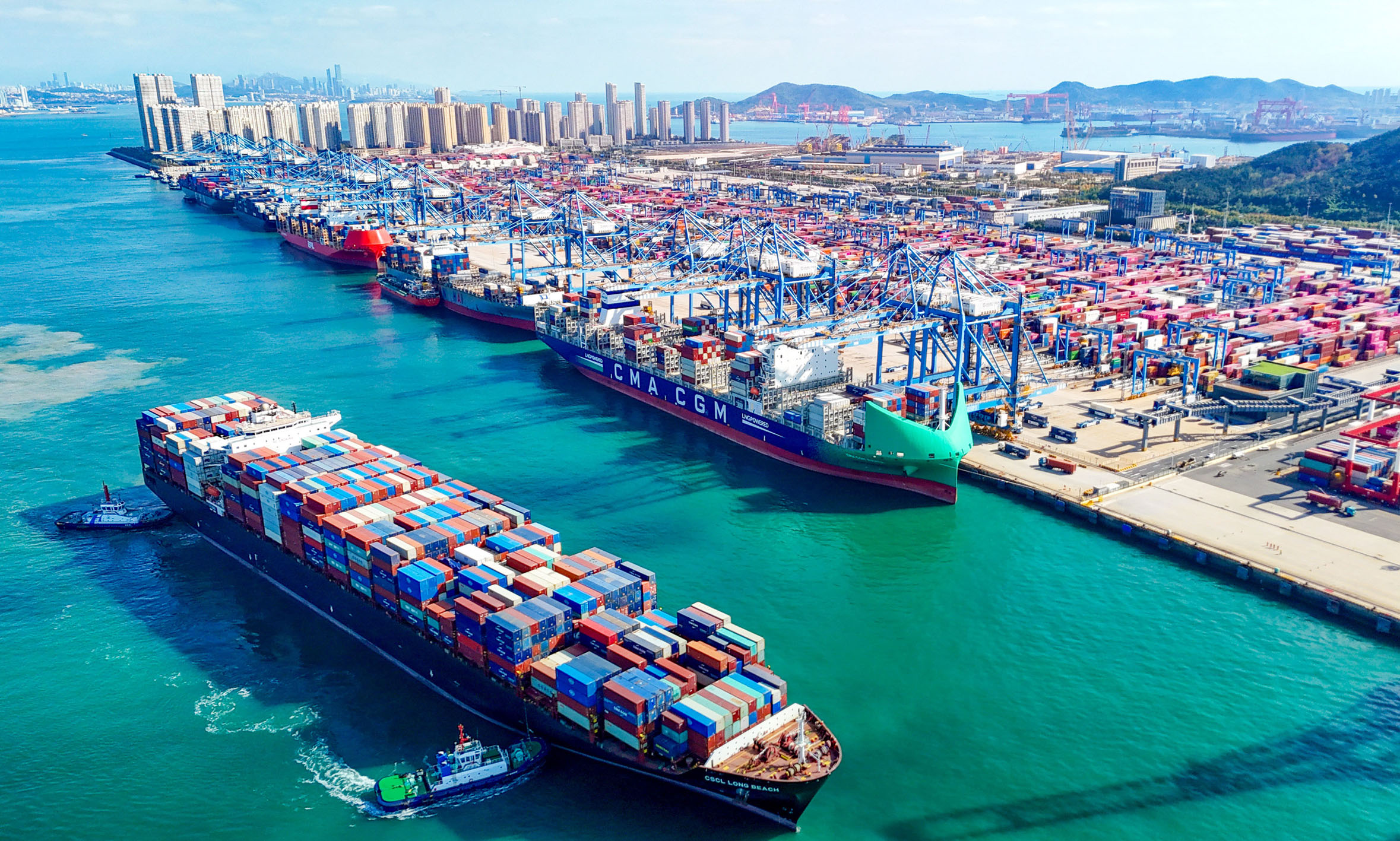 11月5日,一艘货轮满载货物驶出青岛自贸片区(无人机照片)。“双十一”临近,中国(山东)自由贸易试验区青岛片区跨境电商包裹量不断增加,商品高效通关后密集装卸船。自贸区挂牌六年来,通过创新“区关港+”联动机制等百余项举措,为畅通国内国际双循环提供了坚实的物流支撑。