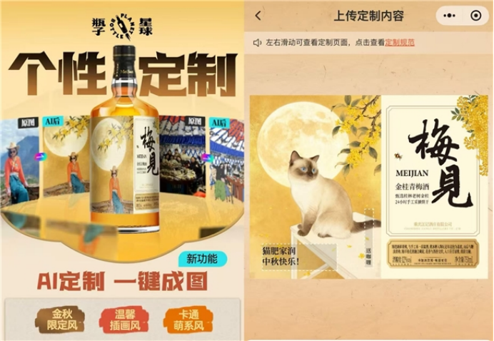 瓶子星球也与火山引擎展开合作,推出了“梅见”、“江小白”品牌的个性化AI定制酒。用户可以上传图片DIY定制酒标,选择多种生动精美的图片风格,并附上祝福语,这种互动方式更加符合抖音上年轻消费群体的喜好。