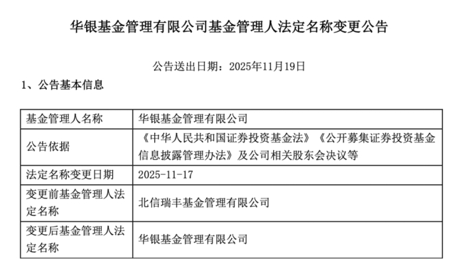 11月19日,华银基金管理有限公司正式登场。该公司发布法定名称变更公告,原“北信瑞丰基金管理有限公司”变更为“华银基金管理有限公司”,并强调法律主体和对外法律关系不变。