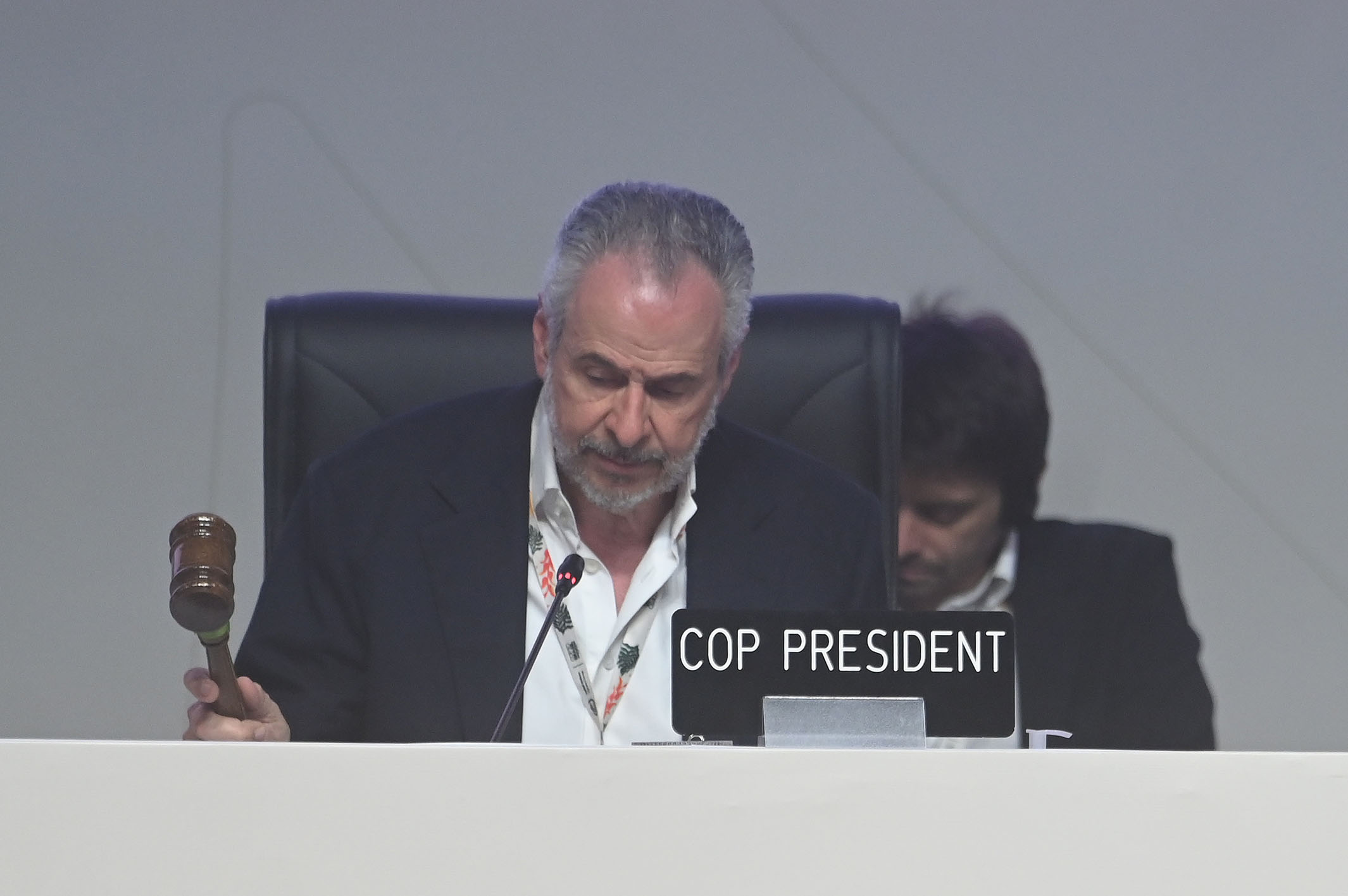 图为在《联合国气候变化框架公约》第三十次缔约方大会上,大会主席多拉戈敲槌确认会议决定。新华社发(卢西奥·塔沃拉 摄)