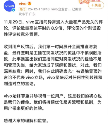 声明称,11月29日,vivo直播间异常涌入大量和产品无关的评论,评论数量高达平时的8.9倍,评论区的个别诋毁性评论被意外置顶。