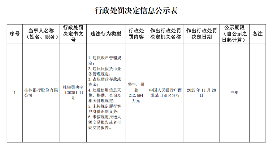 近日,中国人民银行官网显示,桂林银行因违反账户管理、反假货币业务管理规定、占压财政存款或资金、违反信用信息采集相关管理规定、未按规定履行客户身份识别义务、未按规定报送大额交易报告或者可疑交易报告等六项违规行为,被中国人民银行广西壮族自治区分行罚款212.994万元。同时,公司运营管理部的2位员工对以上部分违规行为负有责任,分别收到4.3万元和1.1万元的罚款。