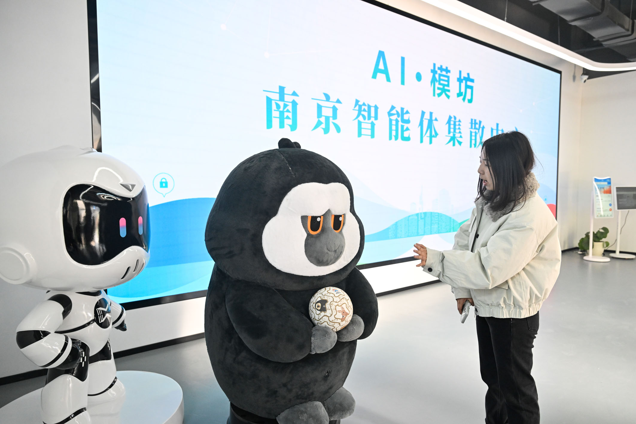 图为在南京人工智能生态街区的“AI·模坊”南京智能体集散中心,一位女士与机器人互动。