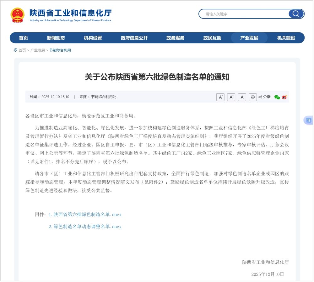 陕西省工业和信息化厅《关于公布陕西省第六批绿色制造名单的通知》官方网站截图
