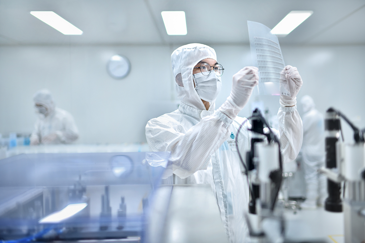 图为硅基仿生研发人员对CGM印刷电极进行人工复检。(资料照片)