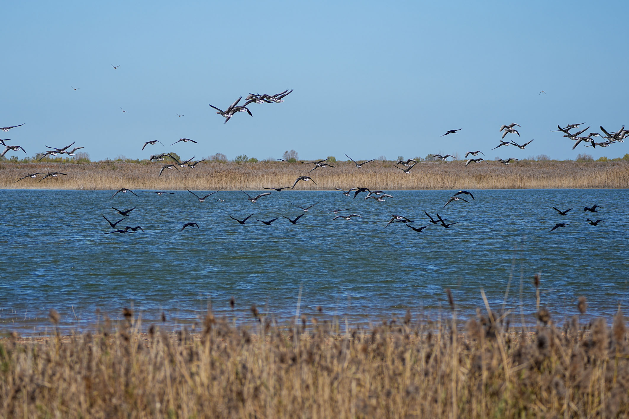黄河三角洲国家级自然保护区内,越冬候鸟在飞翔。记者 朱峥 摄