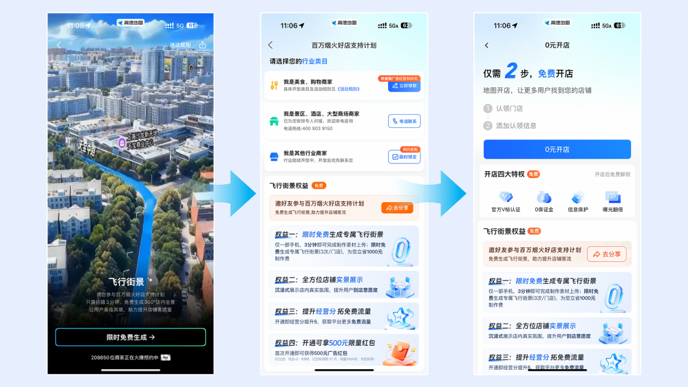 在此基础之上,高德在会上正式启动“百万烟火好店支持计划”,宣布将投入数亿元算力资源,免费为全国100万家中小商户接入“飞行街景”功能。该计划还将联合超过100个城市,围绕零门槛入驻、消费趋势洞察、地方特色活动打造、专属出行补贴等方面提供系统性支持,持续助力线下实体经济发展,进一步体现了高德作为科技平台服务实体经济的切实担当。