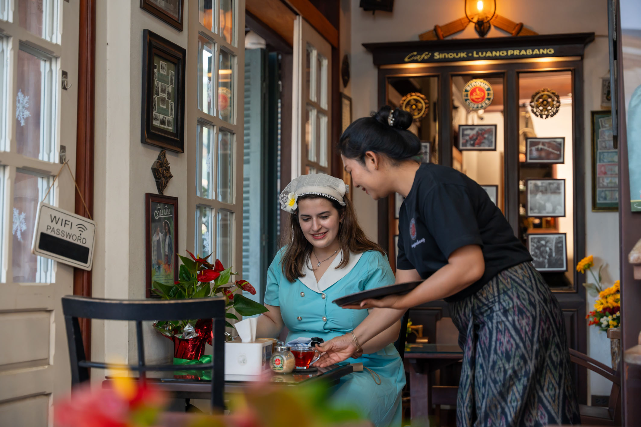 图为在老挝琅勃拉邦一家咖啡店,服务员为顾客端上咖啡。