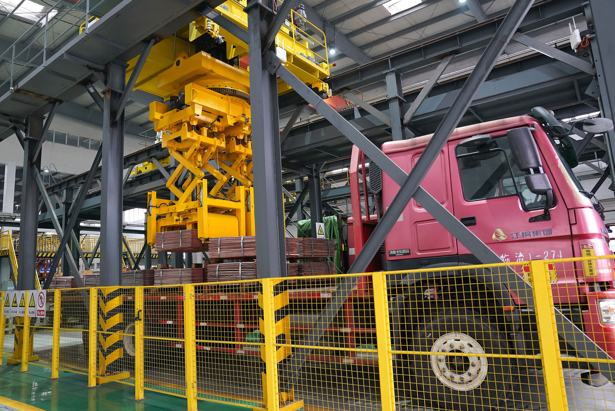 自2016年启动智能工厂一期建设,江西铜业集团有限公司贵溪冶炼厂将智能技术深度融入生产各环节,探索形成多个典型应用场景,打造智慧冶炼样板工厂,以科技赋能企业高质量发展。图为智能化电解车间在进行铜板自动装车作业。