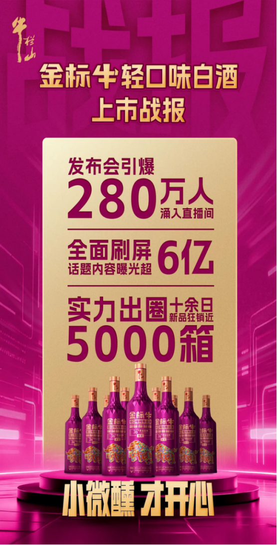 2026年1月13日,金标牛轻口味白酒新品发布会以线下举办、线上直播的形式呈现。这并非一场单向的宣告,而是一次对前期所有好奇与认可的真诚回应——系统阐述企业打造这款产品的思考与初衷。当天,超过280万观众涌入抖音官方旗舰店直播间,随后一周内,关于金标牛轻口味白酒的话题持续升温,截至目前累计收获全网超6亿的曝光量。