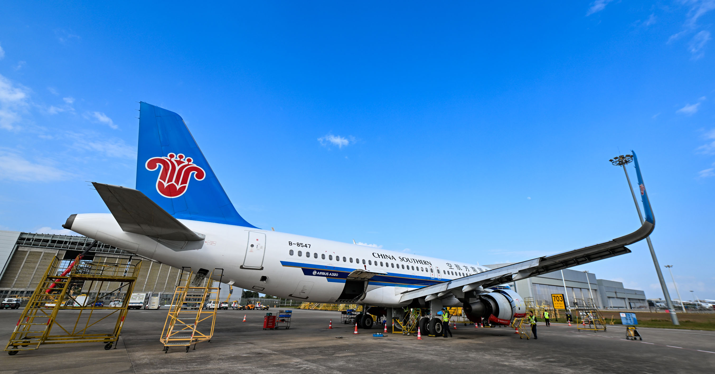 1月29日,海口美兰国际机场停机坪上,南航工程技术分公司机务工程师在对飞机进行深度检查。