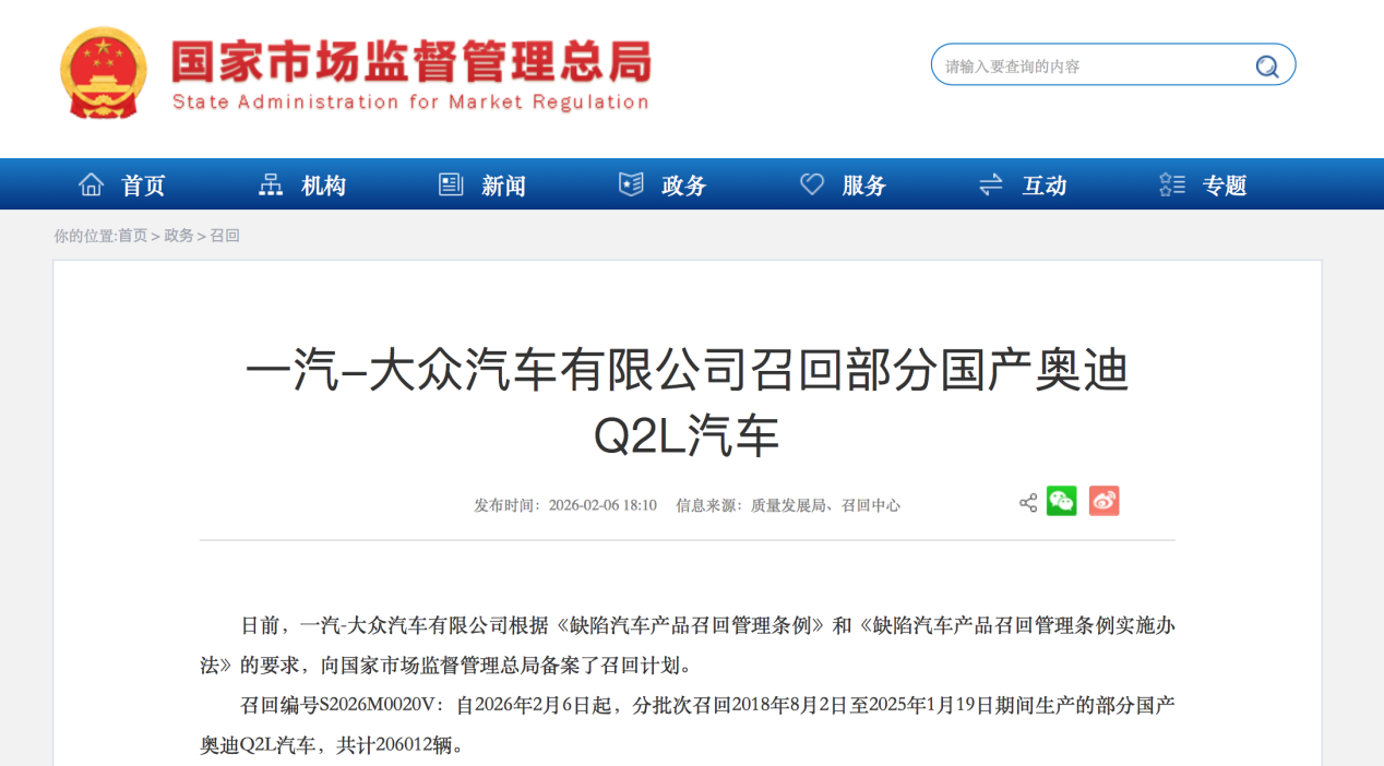 召回编号S2026M0020V:自2026年2月6日起,分批次召回2018年8月2日至2025年1月19日期间生产的部分国产奥迪Q2L汽车,共计206012辆。