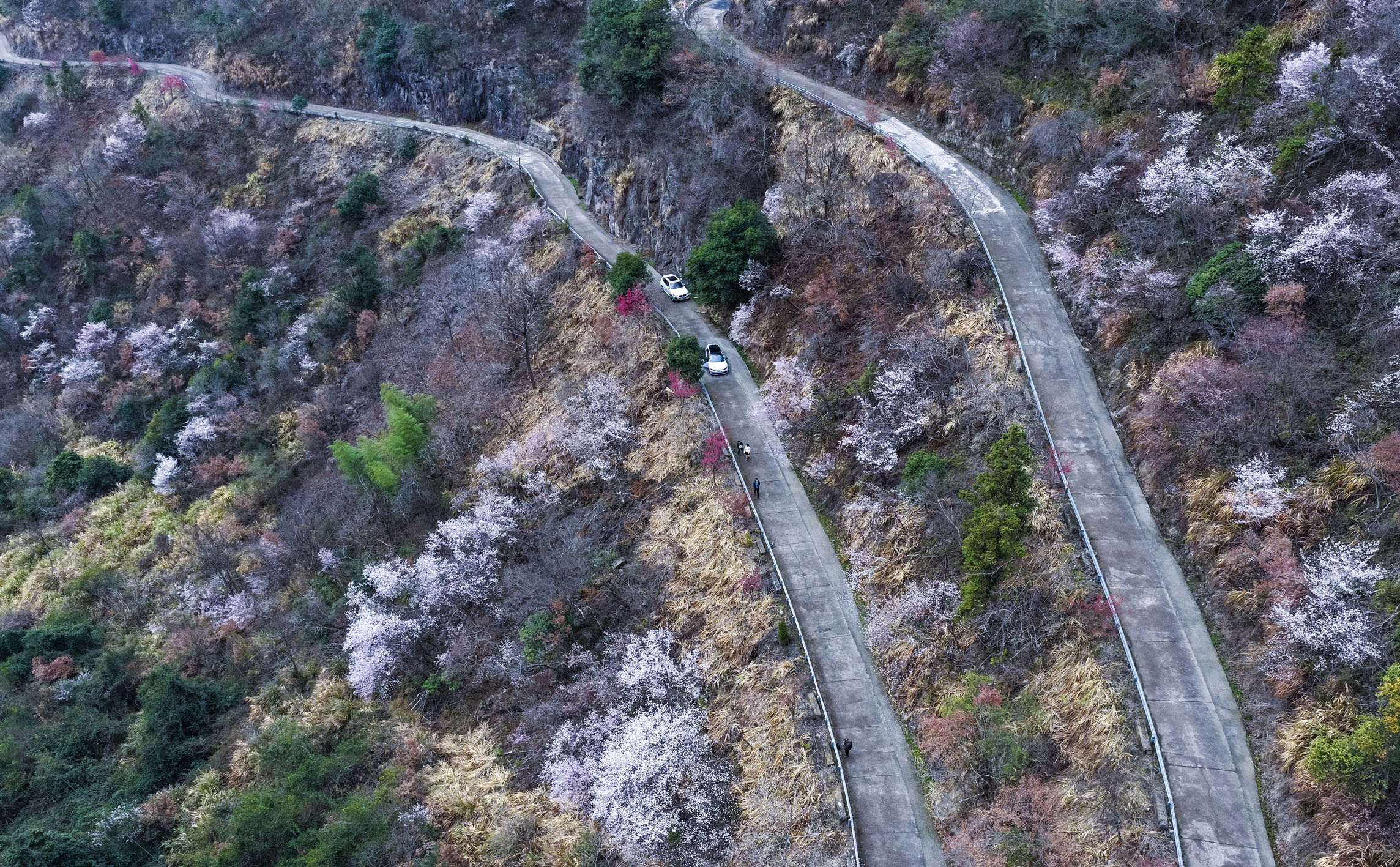 近日,浙江省建德市三都镇数万亩野生樱花进入盛花期,将山乡装点成春意盎然的美丽画卷,吸引众多游客前来打卡,带动当地民宿、农家乐消费升温。图为2月25日拍摄的漫山遍野盛开的野樱花(无人机照片)。