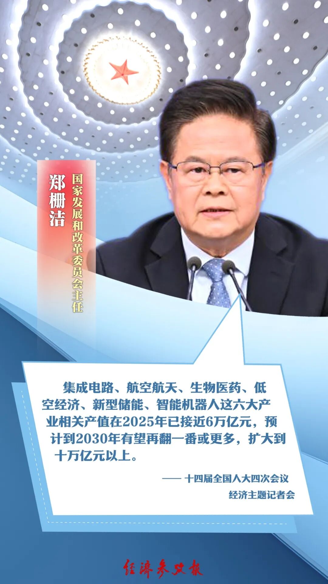 在3月6日举行的十四届全国人大四次会议经济主题记者会上,国家发展和改革委员会主任郑栅洁表示,将重点打造六个大的新兴支柱产业和六个大的未来产业。