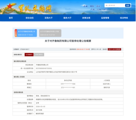 公告显示,齐鲁制药有限公司因“其他、其他违规行为”被处理。根据军队供应商管理相关规定,自2026年3月3日起,暂停其参加全军物资工程服务采购活动资格,组织形式为自行采购,处理部门为解放军某部。