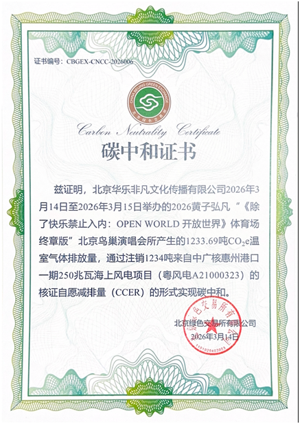 演唱会活动预计将产生约1234吨二氧化碳,演艺公司主动践行社会责任购买相应核证自愿减排量(CCER),用于抵销活动期间所产生的排放。——这是国家体育场(下称“鸟巢”)2026年开年推进的首场大型碳中和行动。据悉,未来,“鸟巢”大型活动将积极践行碳中和,通过示范标杆效应,引导全社会践行绿色发展理念。