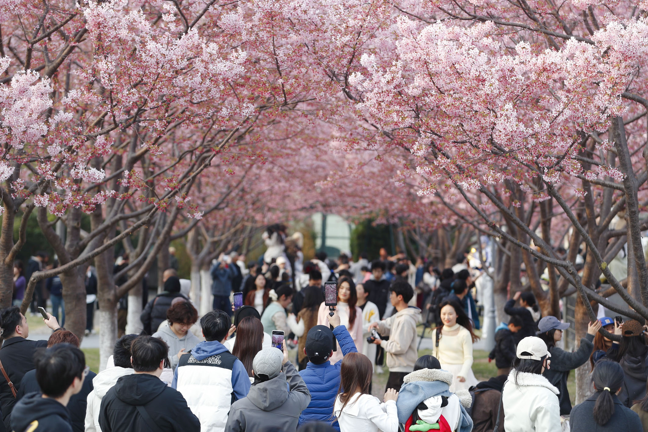 3月16日,人们在浙江省宁波市鄞州区文化广场观赏盛开的樱花。