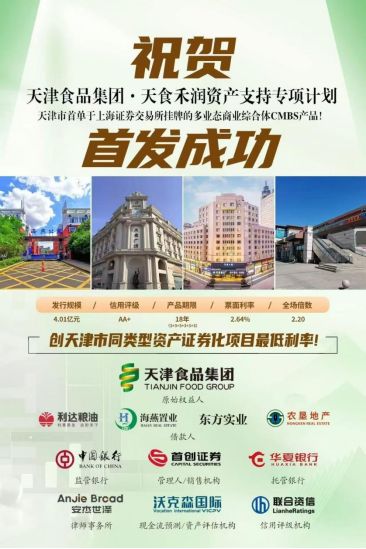 近日,由首创证券担任计划管理人及独家主承销商的“天津食品集团・天食禾润资产支持专项计划”成功发行。项目发行规模4.01亿元,期限18年(每3年开放),发行票面利率2.64%,为天津市首单在上海证券交易所挂牌的多业态商业综合体CMBS产品,创天津市CMBS产品票面利率历史新低。