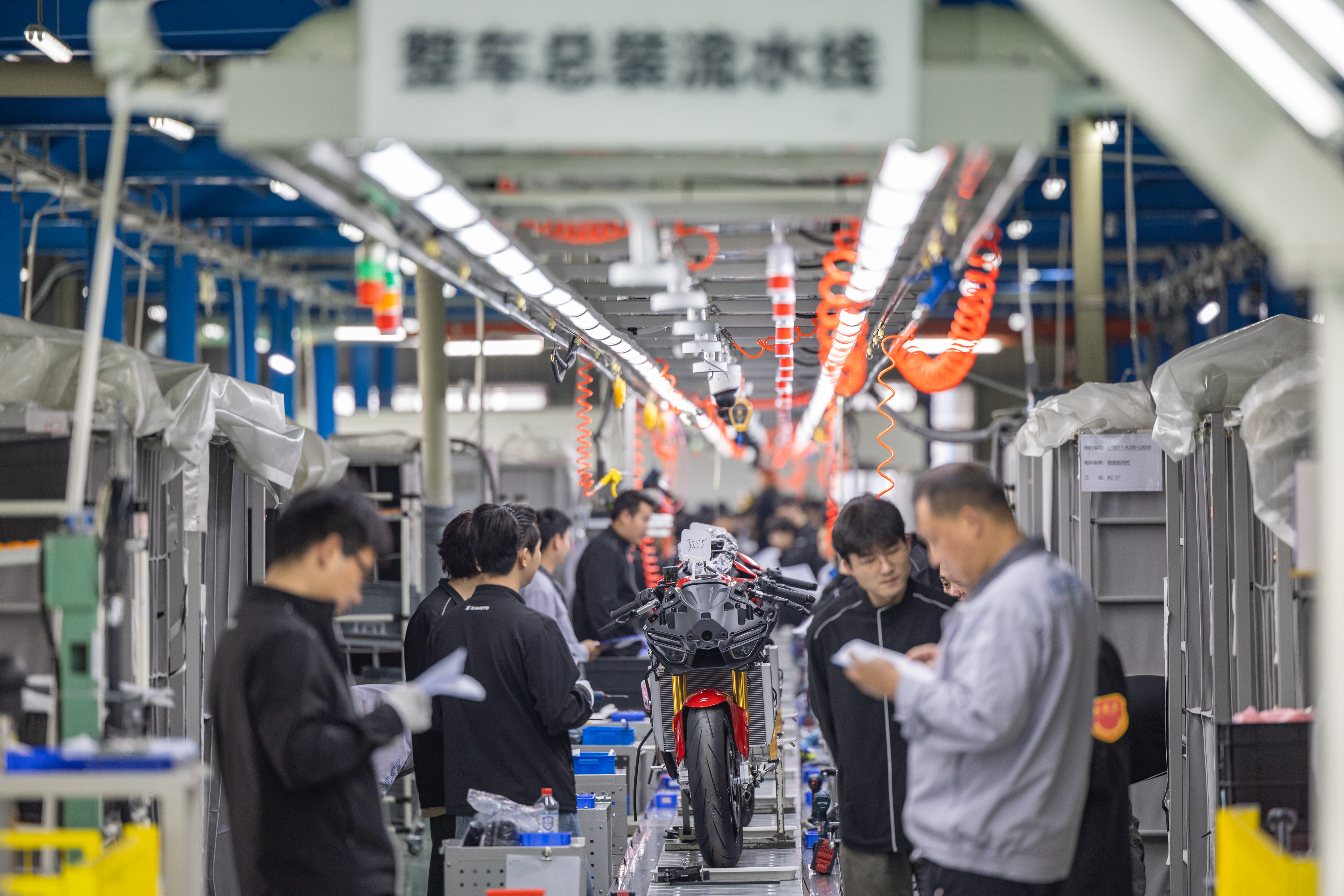 4月1日,工作人员在重庆两江新区“张雪机车”生产车间整车总装流水线上作业。新华社记者 黄伟 摄
