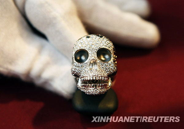 10月30日,在比利时布鲁塞尔的超级奢侈品展开幕前 ,工作人员展示一枚打造成骷髅状的钻石戒指。这枚戒指价值8560欧元。奢侈品展上亮相的除了珠宝,还有汽车、艺术和时尚类展品。新华社/路透