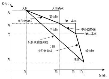 C段投机派发趋势线方程式: Pc=P4+Sc(t) 式中,P4:是初始化值。 Pc:C段的价格函数。 Sc:C段直线的斜率,它是负数。 t:时间变量,取值T1到T4。 C段三台阶与B段三台阶一样,给计算机提供了大量的优化数据和参数。这三个台阶均给出了: ●三项股价上升高度数据(P3-P4、P2-P3、P1-P2); ●三个时间平台的天数(T2-T1、T3-T2、T4-T3); ●三项股价上升斜率(Scl、Scm、Sch); ●C段低价趋势线 C段低价趋势线方程式: Pcl=P2+Sbl(t) 式中,P2:是初始化值。 Pcl:C段的价格函数。 Sbl:C段低价阶直线斜率,它是负数。 t:时间变量,取值T3至T4。 C段低价阶的随机过程是: {Pcl(t),t∈T3,T4} 式中,Pcl(t):样本函数。 t:时间变量。 (T3,T4):是样本空间的起始时间段。 图2-22C段股价三台阶下降走势示意图 ●C段中价趋势线 C段中价趋势线方程式: Pcm=P3+Scm(t) 式中,P3:是初始化值。 Pcm:C段中价阶的价格函数。 Scm:C段中价阶直线斜率,它是负数。 t:时间变量,取值T2至T3。 C段中价阶的随机过程是: {Pcm(t),t∈T2,T3} 式中,Pcm(t):样本函数。 t:时间变量。 (T2,T3):是样本空间的起始时间段。 ●C段高价趋势线 C段高价趋势线方程式: Pch=P4+Sch(t) 式中,P4:是初始化值。 Pch:C段高价阶的价格函数。 Sch:C段高价阶直线斜率,它是负数。 t:时间变量,取值T3至T4。 C段高价阶的随机过程是: {Pch(t),t∈T1,T2} 式中,Pch(t):样本函数。 t:时间变量。 (T1,T2):是样本空间的起始时间段。 ●三项换手率。 ●三项成交量。 ●三项持股人数变化。 为计算机数据统计和分析提供重要数据和参数。同时又把投机拉升趋势线划分为三条更短的趋势线进行研究。股价的走势又是叠加在这三条趋势上的随机过程,计算机的精确预测又提供了三个细分数学模型。