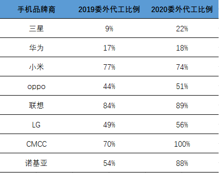 图3 主要头部手机厂商的委外代工情况。