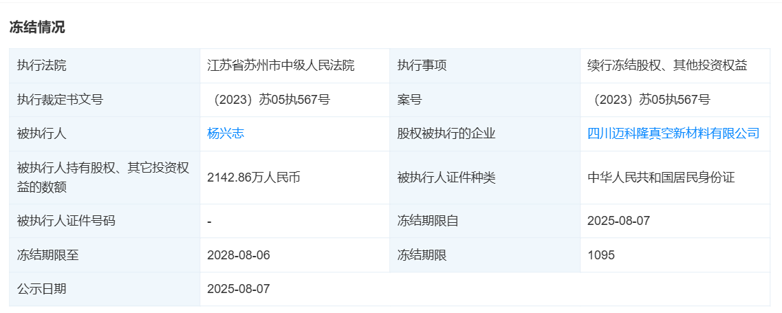 天眼查显示,杨兴志作为被执行人,有2条股权冻结信息,其持有的迈科隆股权及其它投资权益遭司法冻结。其中一次冻结由江苏省苏州市中级人民法院执行,冻结的股权价值为2142.86万元。冻结期限为1095天,从2025年8月7日开始计算,至2028年8月6日结束。