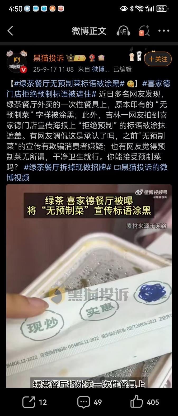 近日,多名网友发现绿茶餐厅已经悄悄撤下了门店外“本店无预制菜,现点现做”的广告语。9月17日,黑猫投诉官方微博发文称,有多名网友发现,绿茶餐厅外卖的一次性餐具上,原本印有的“无预制菜”字样已被涂黑。对此,有网友称之前“无预制菜”的宣传有欺骗消费者嫌疑。
