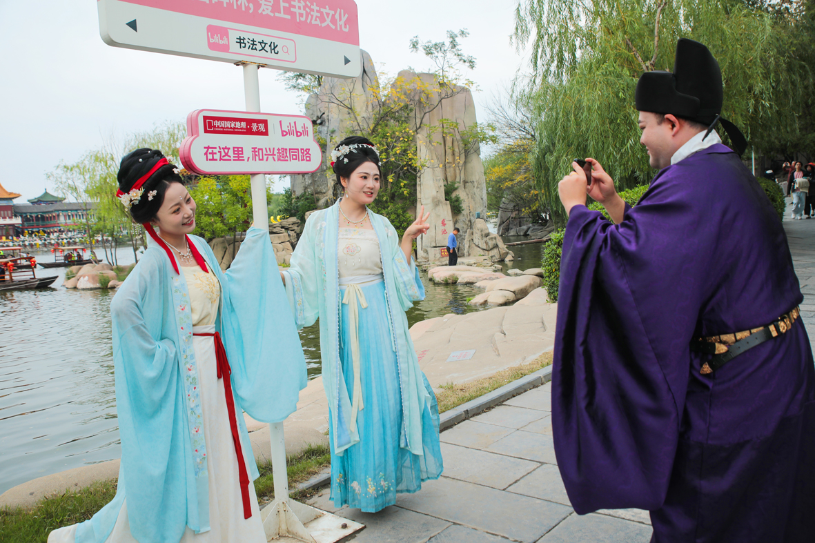 游客身着宋式汉服在河南开封翰园碑林景区拍照打卡。李新义 摄