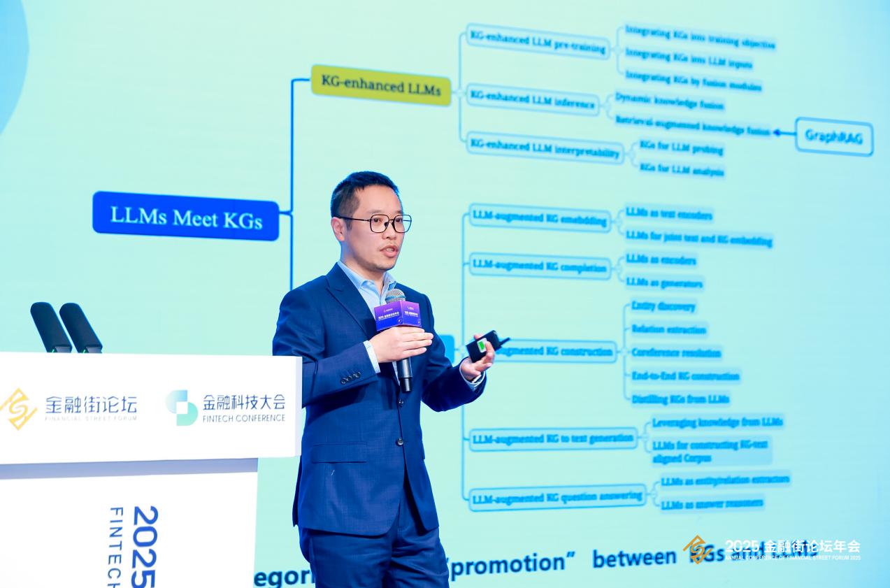 在“2025年国际标准金融应用卓越案例”发布环节,蚂蚁集团技术战略与执行部副总经理彭晋首先介绍了知识图谱在金融领域的国际标准与实践,阐述了知识图谱在反欺诈、风控等场景的应用价值,并提出知识与大模型融合是未来方向,可增强AI的精准性与可解释性。