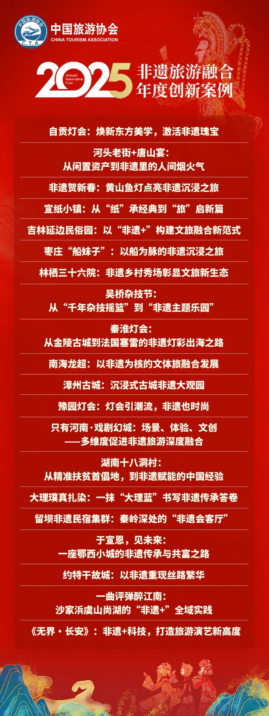 此次活动发布了20个2025非遗旅游融合年度创新案例,分别为《自贡灯会:焕新东方美学,激活非遗瑰宝》《河头老街+唐山宴:从闲置资产到非遗里的人间烟火气》《非遗贺新春:黄山鱼灯点亮非遗沉浸之旅》《宣纸小镇:从“纸”承经典到“旅”启新篇》《只有河南·戏剧幻城:场景、体验、文创——多维度促进非遗旅游深度融合》《湖南十八洞村:从精准扶贫首倡地,到非遗赋能的中国经验》等。