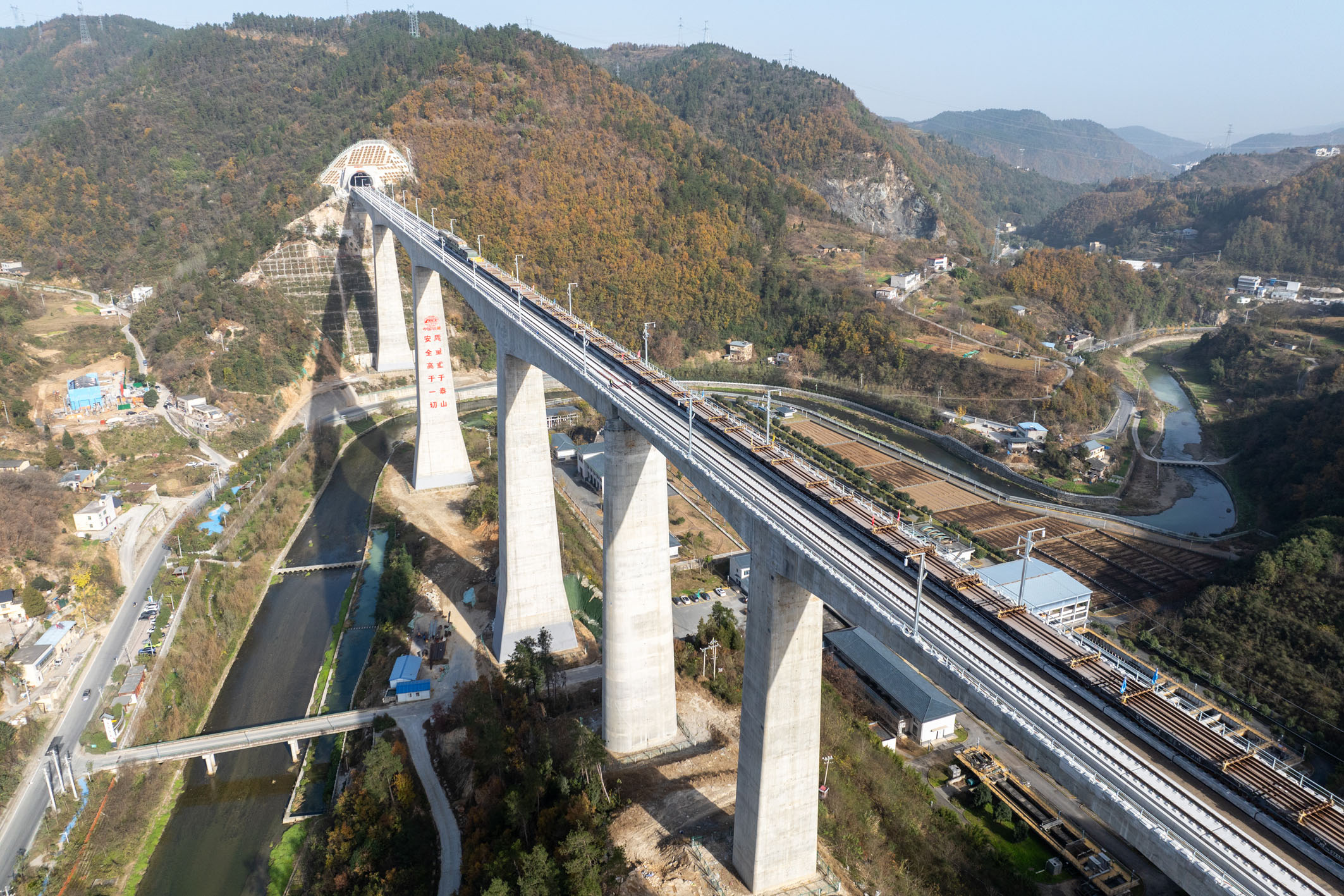 11月27日,在湖北十堰神定河特大桥上,西安至十堰高速铁路(简称“西十高铁”)全线最后一对长钢轨铺设落地,标志着西十高铁全线铺轨工程顺利完工,为后续联调联试奠定基础。西十高铁西起陕西西安,穿越秦岭山脉,终点为湖北十堰,正线全长255.7公里,设计时速350公里。西十高铁开通后,西安至十堰将实现1小时内到达,武汉至西安的铁路运行时间将压缩至2.5小时左右。图为11月27日拍摄的湖北十堰神定河特大桥(无人机照片)。
