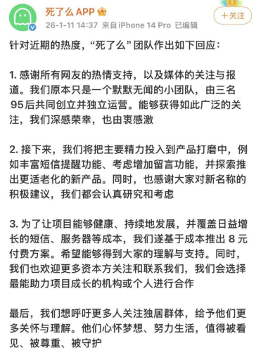 对于上述争议,1月11日该团队发布微博解释称,为了让项目能够健康、持续地发展,并覆盖日益增长的短信、服务器等成本,遂基于成本推出8元付费方案。接下来,团队将把主要精力投入到产品打磨中,例如丰富短信提醒功能、考虑增加留言功能,并探索推出更加适老化的新产品。同时,团队也感谢大家对新名称的积极建议,表示都会认真研究和考虑。